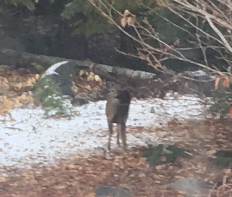 During the snow cleanup process, we try not to cover up all the deer tracks scattered across our property. We still haven’t had any repeat sightings as the deer seem only to visit during the wee hours of the night when we are snoozing. To improve the odds, however, we have baited them 🙂 If you look closely at the picture below, you can see where a deer was digging in the ground near the shore, for the food we planted there.